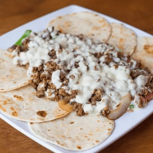 Grilled steak, bacon ham, onion, green peppers, topped with melted cheese, and your choice of flour or corn tortillas