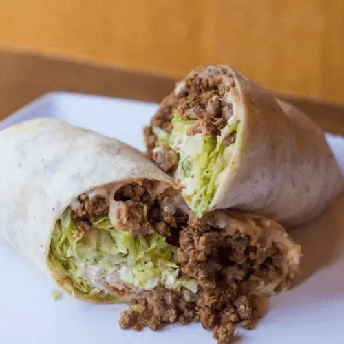 Beans, lettuce, tomatoes, cheese, sour cream, and your choice of meat wrapped in a big flour tortilla